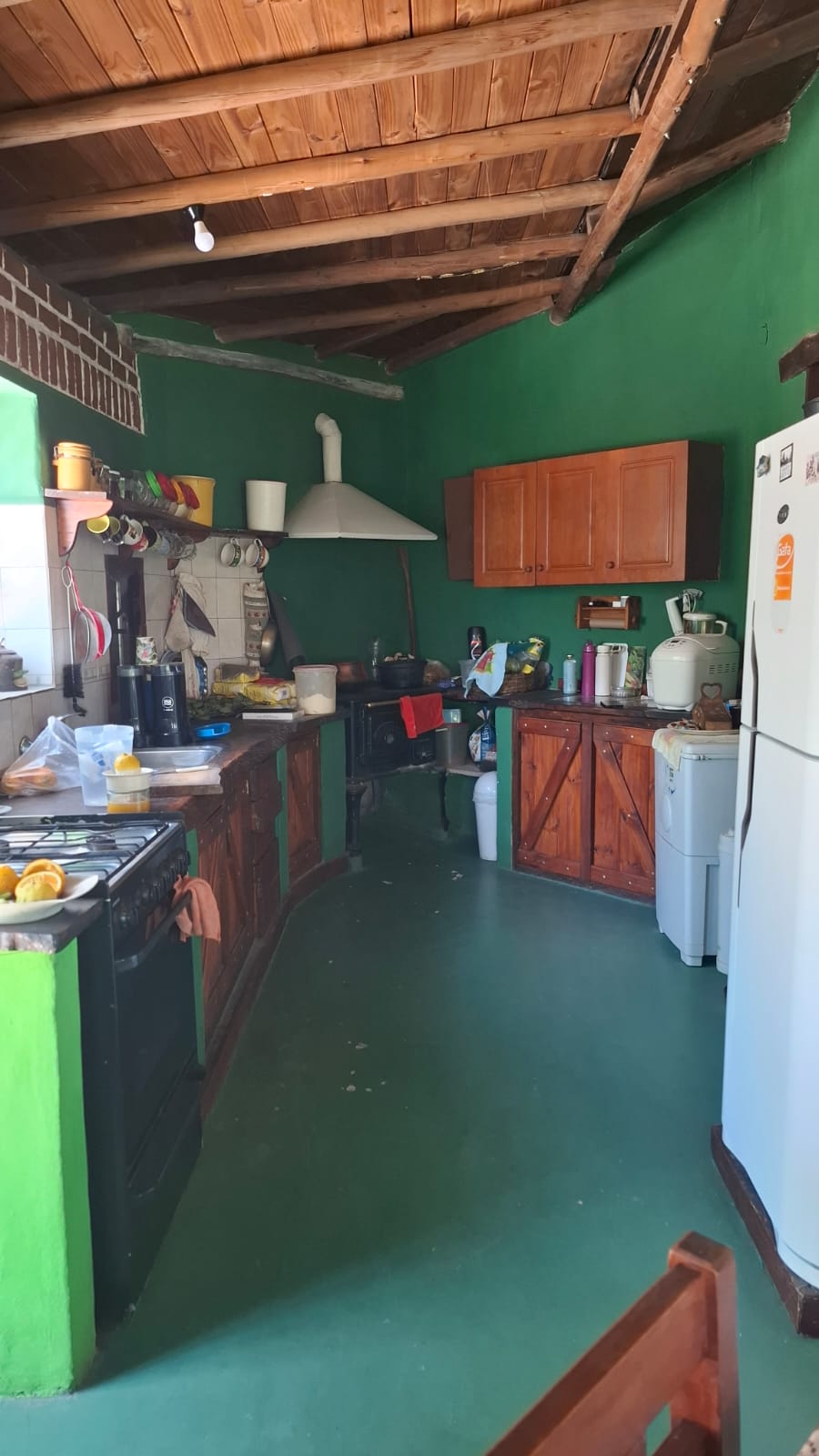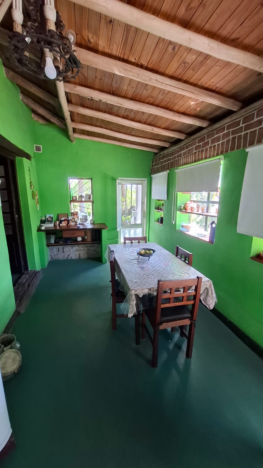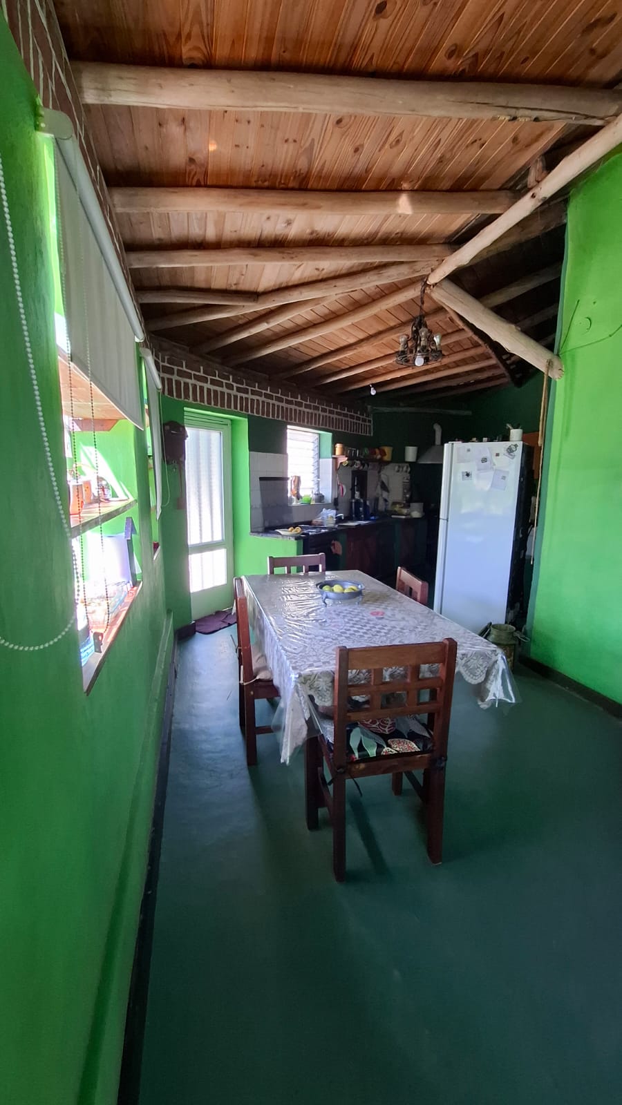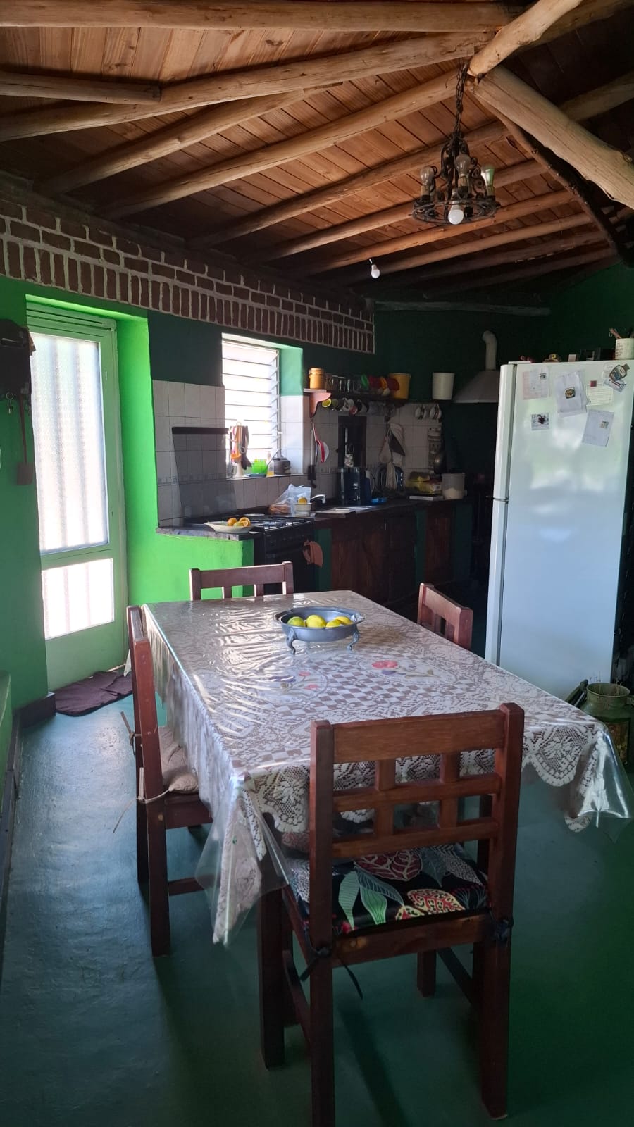 - Cocina-Comedor: Integrados, con mesada, bajomesada y alacena de madera rústica. Equipado con cocina económica.
